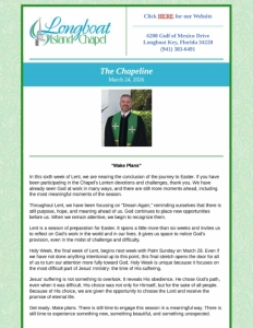 reviews, many photos, and other vital information. We’re currently blessed with and serve over 630 Facebook followers, and continue to make activity and event announcements there. So – why not come for a visit and like us on Facebook? If you do, chances are you will not miss any of the latest news about Longboat Island Chapel!