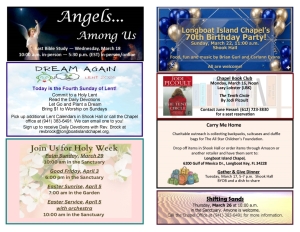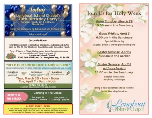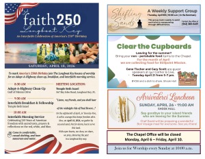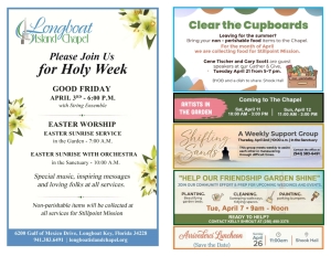 There are numerous ways for you to become active in the Longboat Island Chapel. Here are just a few: Become a volunteer at the Lord’s Warehouse. Volunteer to be an usher or greeter on Sunday mornings. Sign-up sheets are in the Shook Fellowship Hall. Stop by the Chapel...