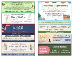 Please continue to donate to our food drive! Our local food pantries are desperate for all types of non-perishable food. Bring what you can to the Chapel and we will make sure it gets to the proper place. Every little bit helps feed those in need. (All items must be...