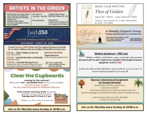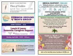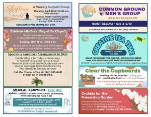 Would you like to honor or remember someone with flowers in the Chapel Sanctuary? Would you like to sponsor special music during Worship? Contact the Chapel Office and we'll help make it possible! Call the Chapel office at (941) 383-6491 or send us a...